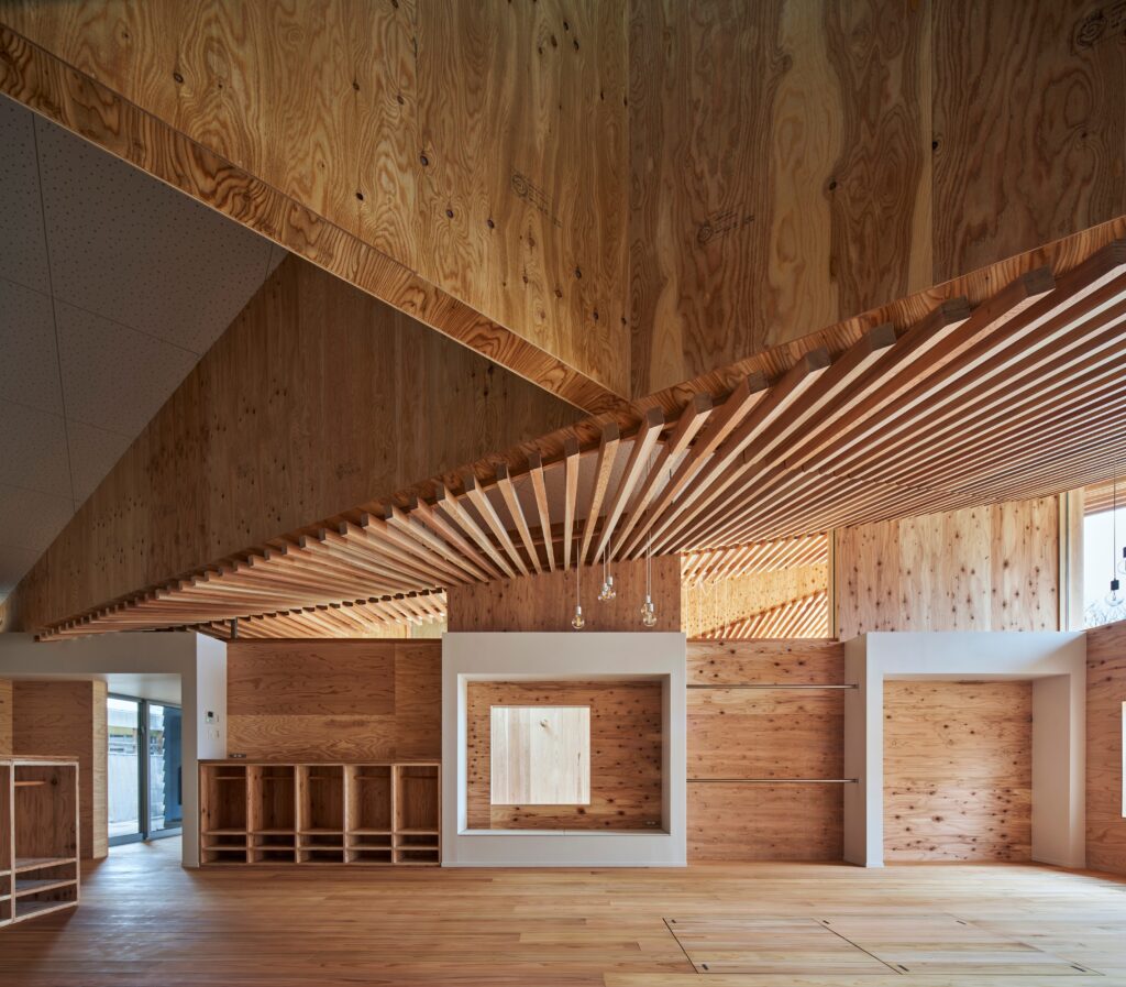 Ook binnen valt de grote hoeveelheid hout op die de architect gebruikte. Wanden en plafonds zijn van hout en onder de cederhouten vloeren zijn airconditioners en warmtewisselaars geïnstalleerd. Hiermee is een luchtkamer gecreëerd zodat kinderen niet zijn blootgesteld aan directe luchtstroom. Stralingswarmte werkt op hun lichaam en creëert comfortabele omstandigheden om te leren en te spelen.