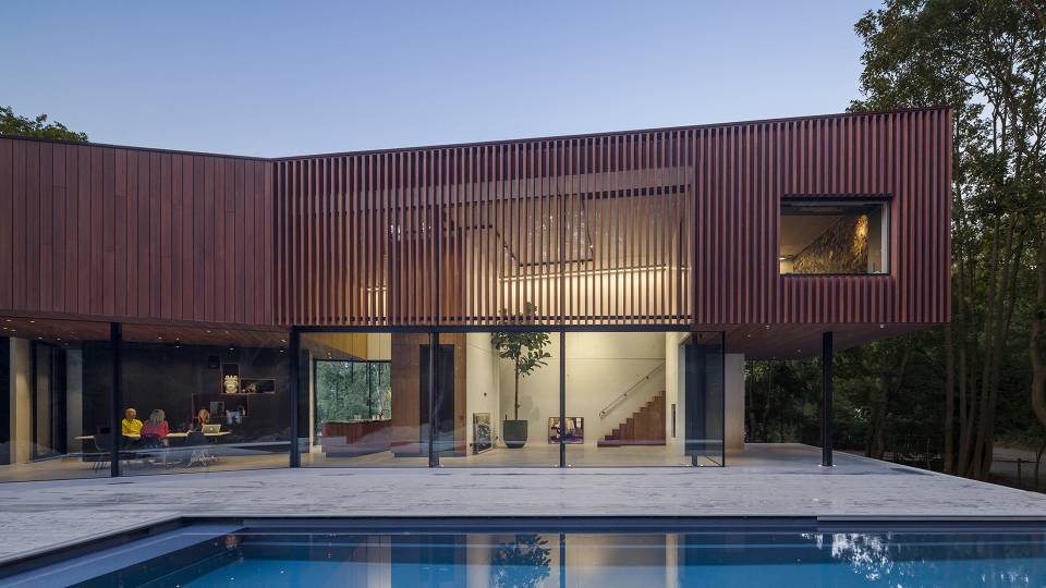 Architectenbureau DP6 ontwierp deze gezinswoning op een bosrijk plot in het nabij Amsterdam gelegen Santpoort. Het terrein was nogal verwilderd maar bleek over een majestueuze beukenlaan te beschikken en een grasveld dat zon-georiënteerd was. DP6 ‘vouwde’ de villa daar in een knik omheen zodat aan een wens van de familie: zo veel mogelijk privacy, tegemoet kon worden gekomen.