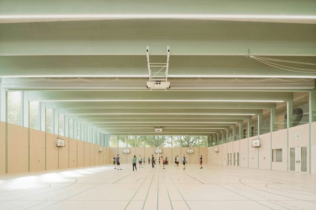 De strak geometrisch vormgegeven, vrijstaande sporthal in Wangen is ontworpen door Steimle Architekten BDA uit Stuttgart. De sportaccommodatie is gebouwd op een van de laatste groene plekken in het centrum van het stadje en omvat naast een driedubbele sporthal twee extra grote fitnessruimtes op de bovenverdieping. De foyer en cafetaria, met hun volledig glazen oppervlak, openen zich naar het noorden.