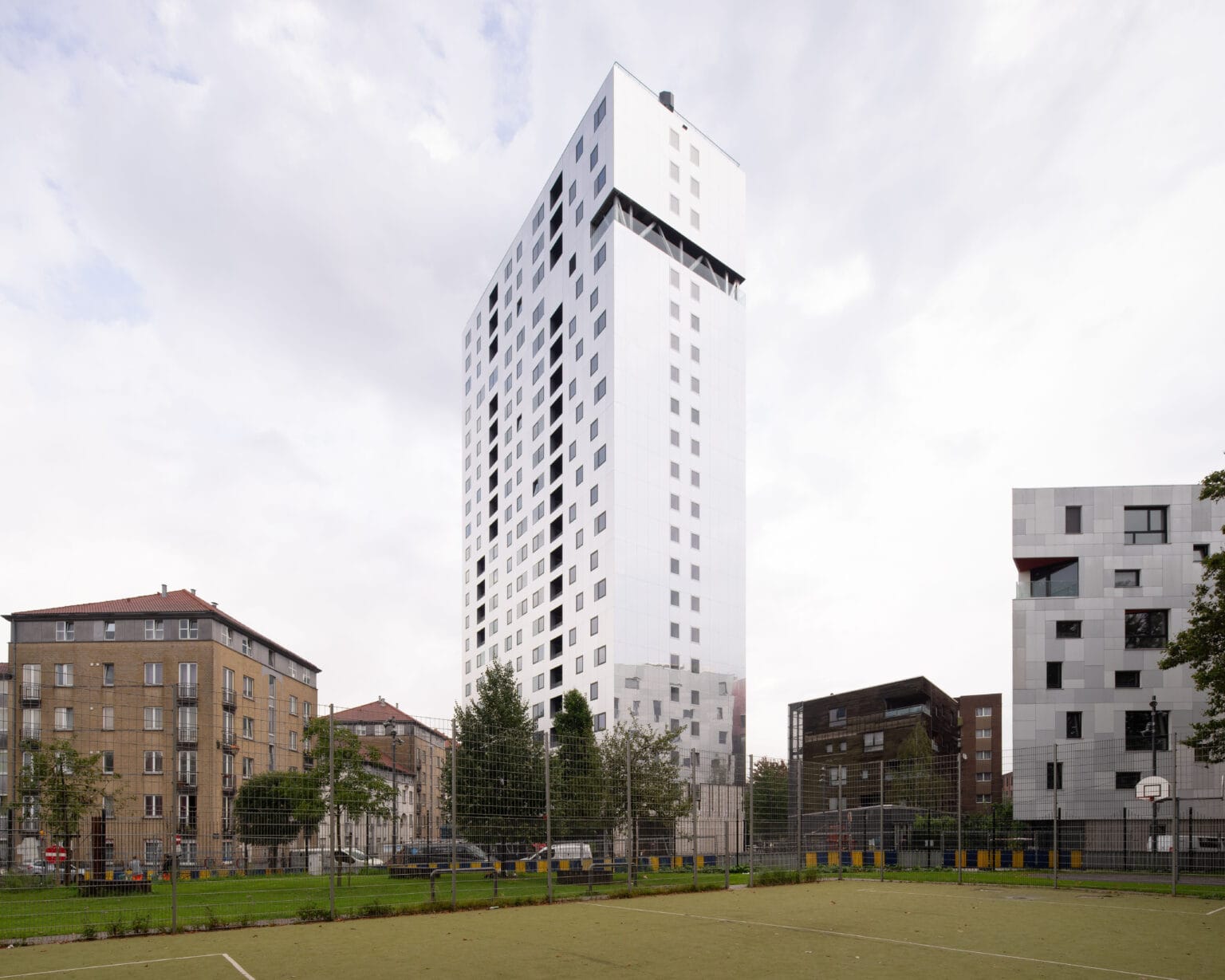 In deze categorie zijn zeven seriematige woningbouwprojecten ingezonden. Woontoren Brunfaut van architectenbureau A229 ging er met de eerste prijs vandoor. Deze woontoren uit 1965 in de wijk Molenbeek in Brussel is tot op de stalen draagconstructie gestript, in 5 richtingen uitgebreid en nieuw ingevuld met o.a. CLT vloeren en wanden. Het totaal aantal appartementen is behouden en de typologie gediversifieerd, van studio’s tot appartementen met vijf slaapkamers. Het vloeroppervlakte is verdubbeld door een verhoging van 16 tot 21 verdiepingen en een uitbreiding van de plattegrond. Een nieuwe brugstructuur op de 18e verdieping ondersteunt de verhoging, die steunt op nieuwe laterale funderingen. 10.000 m² CLT-vloeren zijn in de bestaande staalconstructie geplaatst. De windbelasting wordt gestabiliseerd door horizontale krachten om te leiden naar de centrale betonnen kern en de gevelversteviging. Boven een transparante begane grond bestaat de nieuwe gevel uit houtskeletbouw met een spiegelende gevelbekleding.